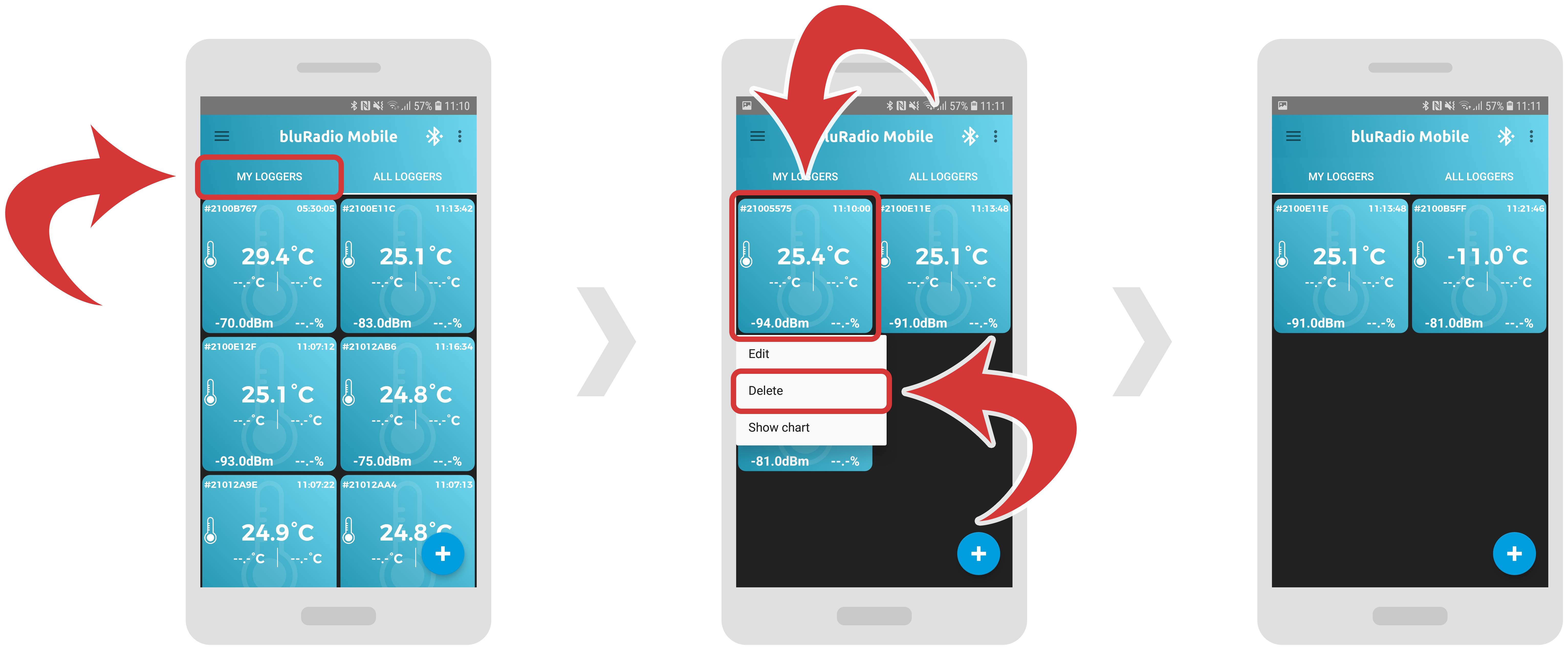 • Aby usunąć rejestrator z listy „Moje” („My loggers”), przechodzimy do zakładki „Moje” („My loggers”). Następnie przytrzymujemy konkretny rejestrator i wybieramy z listy opcję „Delete”.