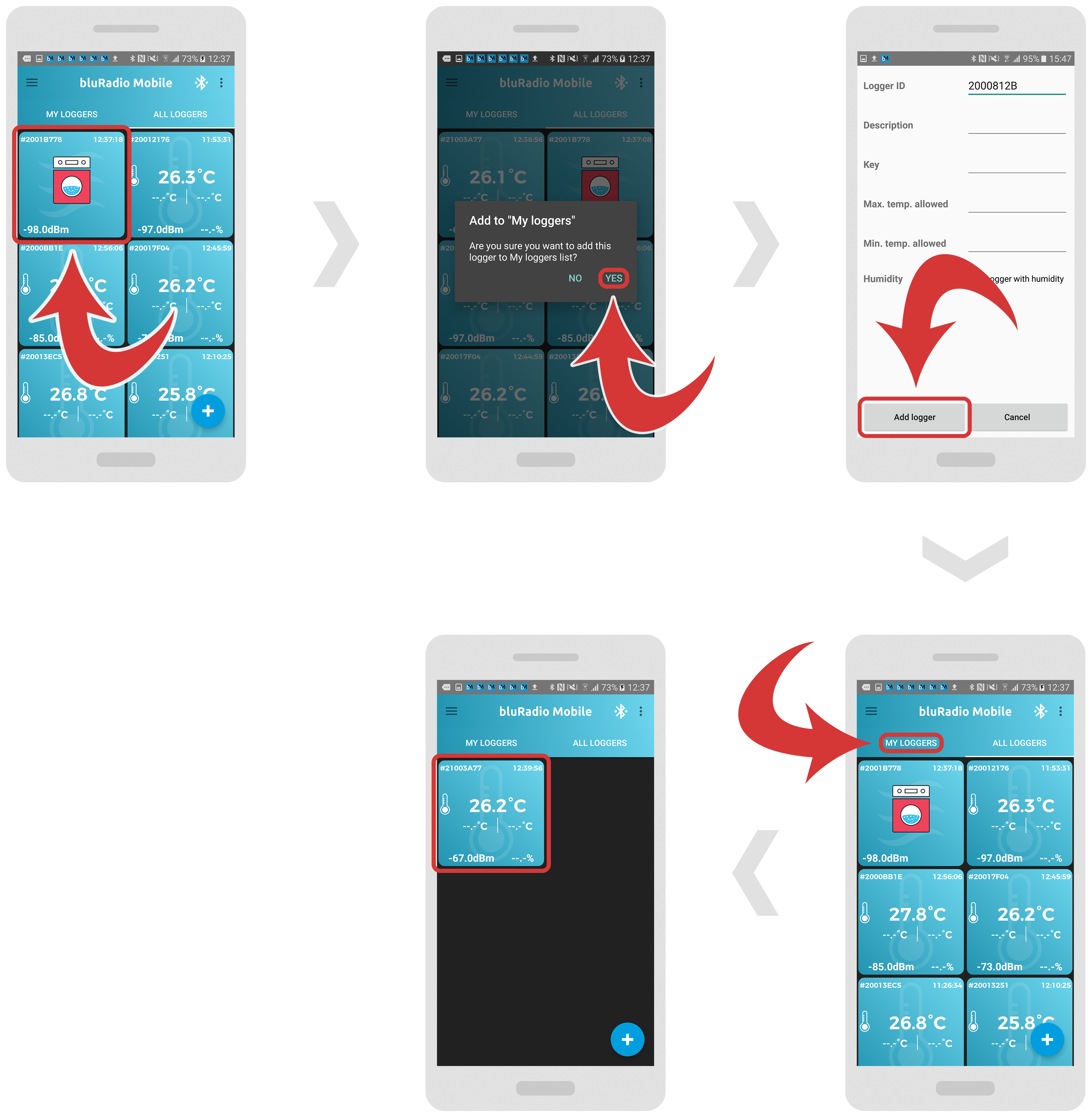 • Dodawanie rejestratorów do listy „Moje” („My loggers”) jest możliwe na dwa różne sposoby. Pierwszym jest przytrzymanie konkretnego rejestratora. Powinno pojawić się nowe okno.